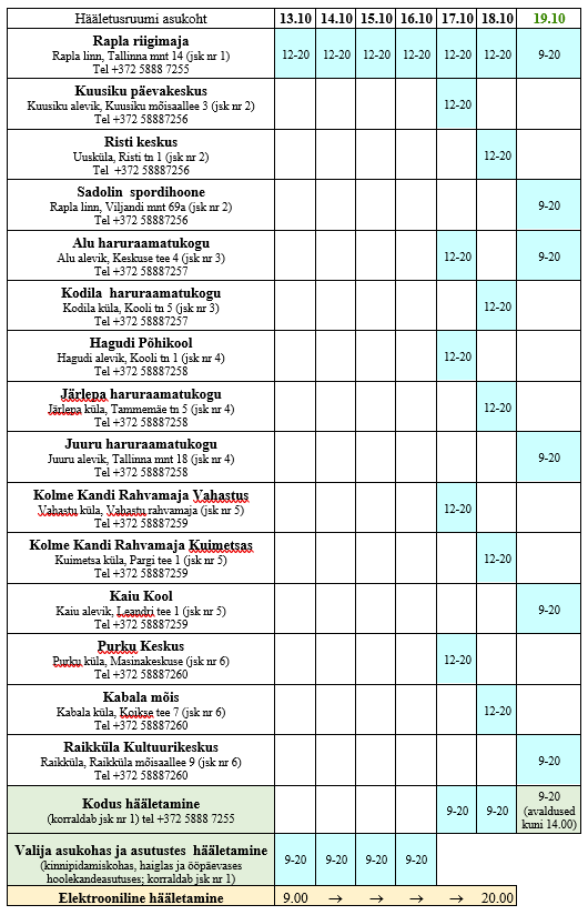 Rapla vallas saab hääleõiguslik isik oma hääle anda sedeliga hääletades eelhääletamisepäevadel 13.-16. oktoobrini Rapla riigimajas ja 17. ning 18. oktoobril valla kõigis valimisjaoskondades kella 12–20 või valimispäeval 19. oktoobril kella 9–20.