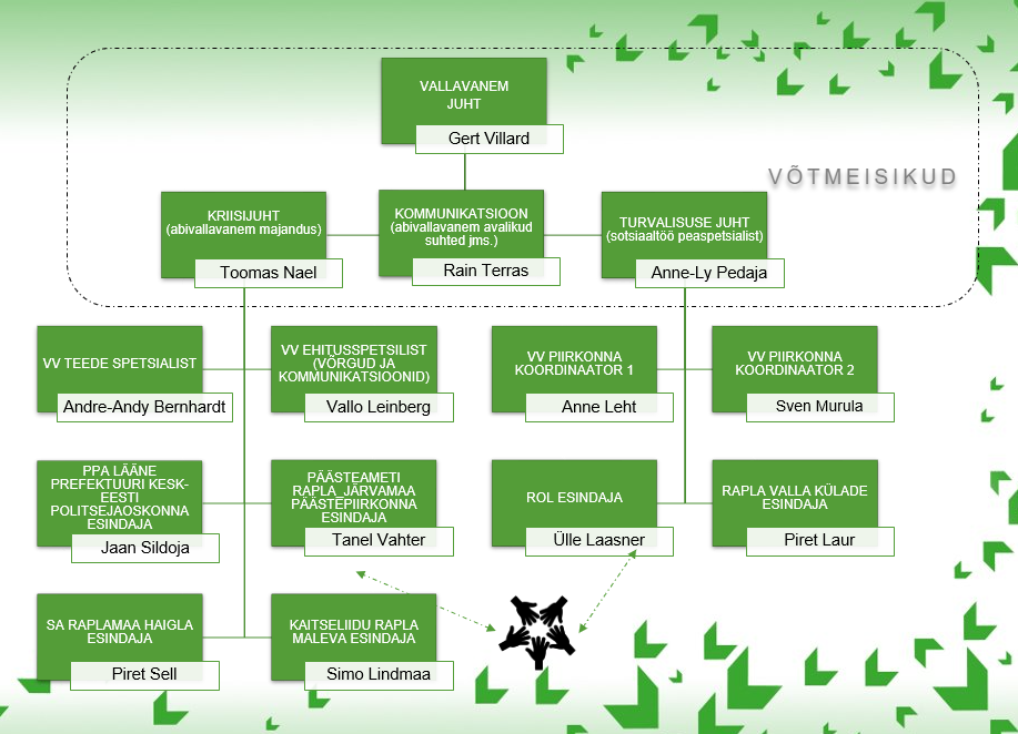 Siseministeeriumi poolt Rapla vallale hangitud mentor ja Ave Viks Collaborative Projects OÜst. TEK programmi koordinaator Agnes Kurvits (agnes.kurvits@rapla.ee, 5373 8273), Rapla valla arendusjuht Heiti Vahtra (heiti.vahtra@rapla.ee, 5344 6645) ning Rapla valla kriisikomisjon, kes on kriisireguleerimise korraldamiseks ja siseturvalisuse arengu juhtimiseks moodustatud järgmises koosseisus: